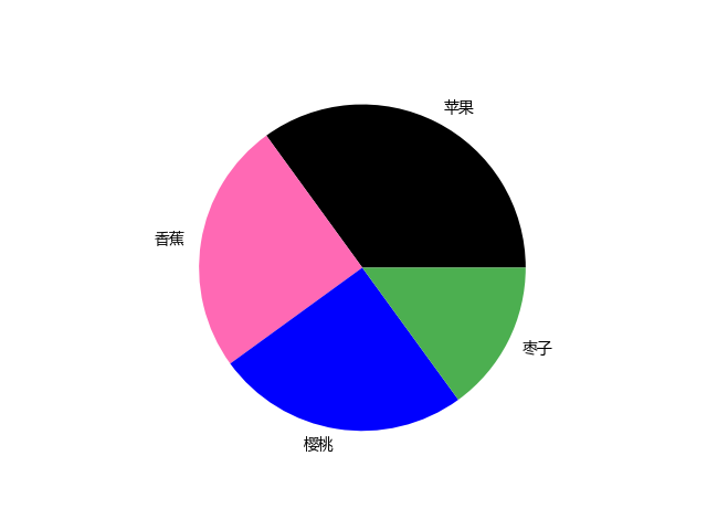 # 这三行代码初始化Python绘图环境: import sys import matplotlib matplotlib.use('Agg') import matplotlib.pyplot as plt import numpy as np # 准备饼图数据: y = np.array([35, 25, 25, 15]) # 饼图各区块占比 mylabels = ["苹果", "香蕉", "樱桃", "枣子"] # 区块标签 mycolors = ["black", "hotpink", "b", "#4CAF50"] # 颜色参数 # 绘制饼图: plt.pie(y, labels = mylabels, colors = mycolors) plt.show() # 显示图表 # 图形输出指令: plt.savefig(sys.stdout.buffer) sys.stdout.flush()