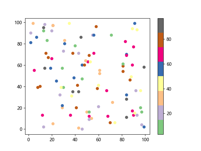 # 这三行代码使编译器能够绘图: import sys import matplotlib matplotlib.use('Agg') import matplotlib.pyplot as plt import numpy as np x = np.random.randint(100, size=(100)) y = np.random.randint(100, size=(100)) colors = np.random.randint(100, size=(100)) # 使用强调色系绘制散点图: plt.scatter(x, y, c=colors, cmap='Accent') plt.colorbar() plt.show() # 这两行代码使编译器能够输出图形: plt.savefig(sys.stdout.buffer) sys.stdout.flush()