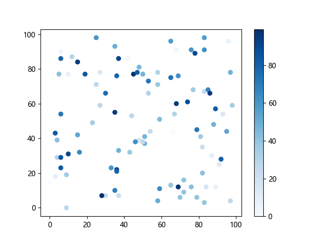 # 这三行代码使编译器能够绘图: import sys import matplotlib matplotlib.use('Agg') import matplotlib.pyplot as plt import numpy as np x = np.random.randint(100, size=(100)) y = np.random.randint(100, size=(100)) colors = np.random.randint(100, size=(100)) # 使用蓝色渐变绘制散点图: plt.scatter(x, y, c=colors, cmap='Blues') plt.colorbar() # 显示颜色条 plt.show() # 显示图形 # 这两行代码使编译器能够输出图形: plt.savefig(sys.stdout.buffer) sys.stdout.flush()