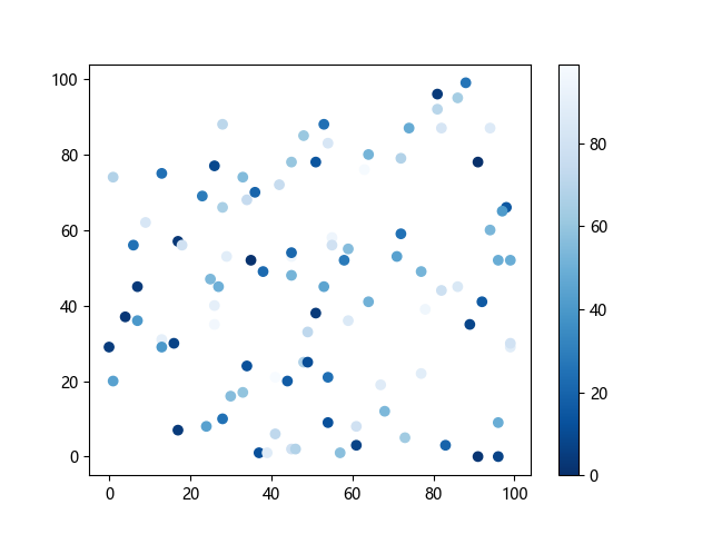 # 这三行代码使编译器能够绘图: import sys import matplotlib matplotlib.use('Agg') import matplotlib.pyplot as plt import numpy as np x = np.random.randint(100, size=(100)) y = np.random.randint(100, size=(100)) colors = np.random.randint(100, size=(100)) # 使用反向蓝色渐变绘制散点图: plt.scatter(x, y, c=colors, cmap='Blues_r') plt.colorbar() # 显示颜色条 plt.show() # 显示图形 # 这两行代码使编译器能够输出图形: plt.savefig(sys.stdout.buffer) sys.stdout.flush()