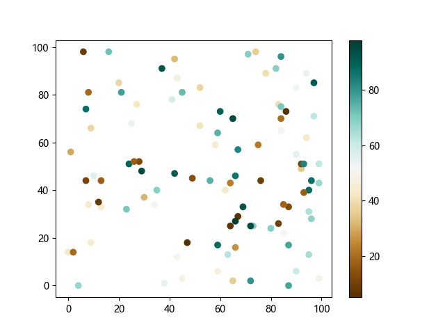 # 这三行代码使编译器能够绘图: import sys import matplotlib matplotlib.use('Agg') import matplotlib.pyplot as plt import numpy as np x = np.random.randint(100, size=(100)) y = np.random.randint(100, size=(100)) colors = np.random.randint(100, size=(100)) # 使用棕蓝绿渐变绘制散点图: plt.scatter(x, y, c=colors, cmap='BrBG') plt.colorbar() # 显示颜色条 plt.show() # 显示图形 # 这两行代码使编译器能够输出图形: plt.savefig(sys.stdout.buffer) sys.stdout.flush()
