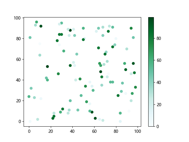# 这三行代码使编译器能够绘图: import sys import matplotlib matplotlib.use('Agg') import matplotlib.pyplot as plt import numpy as np x = np.random.randint(100, size=(100)) y = np.random.randint(100, size=(100)) colors = np.random.randint(100, size=(100)) # 使用蓝绿色渐变绘制散点图: plt.scatter(x, y, c=colors, cmap='BuGn') plt.colorbar() # 显示颜色条 plt.show() # 显示图形 # 这两行代码使编译器能够输出图形: plt.savefig(sys.stdout.buffer) sys.stdout.flush()