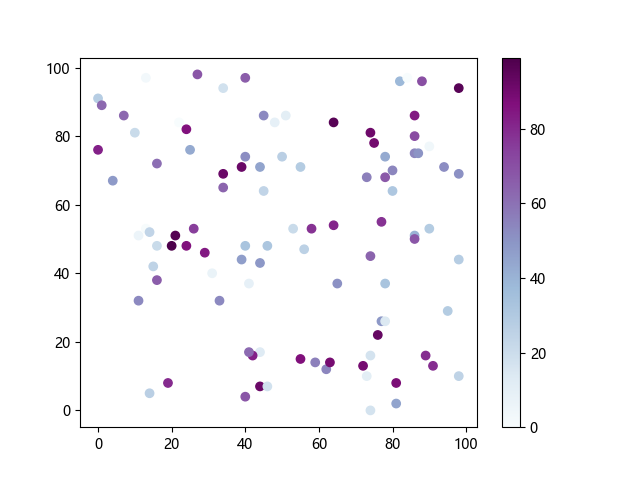 # 这三行代码使编译器能够绘图: import sys import matplotlib matplotlib.use('Agg') import matplotlib.pyplot as plt import numpy as np x = np.random.randint(100, size=(100)) y = np.random.randint(100, size=(100)) colors = np.random.randint(100, size=(100)) # 使用蓝紫色渐变绘制散点图: plt.scatter(x, y, c=colors, cmap='BuPu') plt.colorbar() # 显示颜色条 plt.show() # 显示图形 # 这两行代码使编译器能够输出图形: plt.savefig(sys.stdout.buffer) sys.stdout.flush()