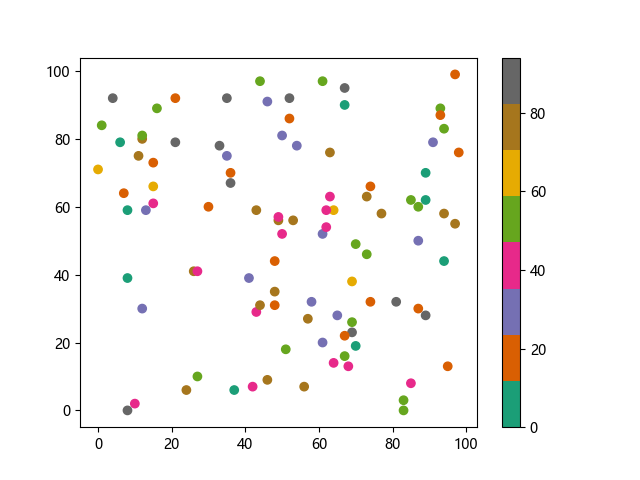 # 这三行代码使编译器能够绘图: import sys import matplotlib matplotlib.use('Agg') import matplotlib.pyplot as plt import numpy as np x = np.random.randint(100, size=(100)) y = np.random.randint(100, size=(100)) colors = np.random.randint(100, size=(100)) # 使用 Dark2 配色方案绘制散点图: plt.scatter(x, y, c=colors, cmap='Dark2') plt.colorbar() plt.show() # 这两行代码使编译器能够输出图形: plt.savefig(sys.stdout.buffer) sys.stdout.flush()