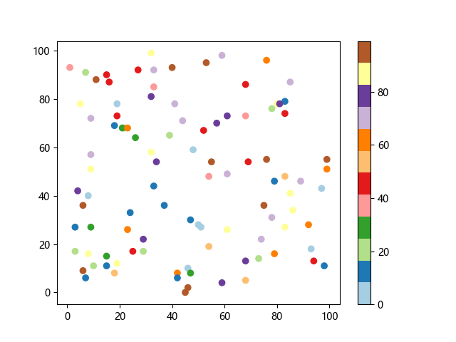 # 这三行代码使编译器能够绘图: import sys import matplotlib matplotlib.use('Agg') import matplotlib.pyplot as plt import numpy as np x = np.random.randint(100, size=(100)) y = np.random.randint(100, size=(100)) colors = np.random.randint(100, size=(100)) # 使用配对色系绘制散点图: plt.scatter(x, y, c=colors, cmap='Paired') plt.colorbar() plt.show() # 这两行代码使编译器能够输出图形: plt.savefig(sys.stdout.buffer) sys.stdout.flush()