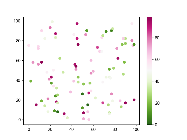 # 这三行代码使编译器能够绘图: import sys import matplotlib matplotlib.use('Agg') import matplotlib.pyplot as plt import numpy as np # 生成随机数据: x = np.random.randint(100, size=(100)) y = np.random.randint(100, size=(100)) colors = np.random.randint(100, size=(100)) # 使用 PiYG_r 配色方案绘制粉绿反向渐变色散点图: plt.scatter(x, y, c=colors, cmap='PiYG_r') plt.colorbar() # 显示颜色条 plt.show() # 显示图形 # 这两行代码使编译器能够输出图形: plt.savefig(sys.stdout.buffer) sys.stdout.flush()