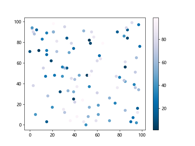 # 这三行代码使编译器能够绘图: import sys import matplotlib matplotlib.use('Agg') import matplotlib.pyplot as plt import numpy as np # 生成随机数据: x = np.random.randint(100, size=(100)) y = np.random.randint(100, size=(100)) colors = np.random.randint(100, size=(100)) # 使用 PuBu_r 配色方案绘制紫蓝色反向渐变色散点图: plt.scatter(x, y, c=colors, cmap='PuBu_r') plt.colorbar() # 显示颜色条 plt.show() # 显示图形 # 这两行代码使编译器能够输出图形: plt.savefig(sys.stdout.buffer) sys.stdout.flush()