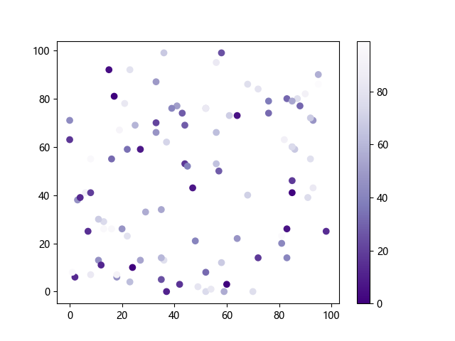 # 这三行代码使编译器能够绘图: import sys import matplotlib matplotlib.use('Agg') import matplotlib.pyplot as plt import numpy as np # 生成随机数据: x = np.random.randint(100, size=(100)) y = np.random.randint(100, size=(100)) colors = np.random.randint(100, size=(100)) # 使用 Purples_r 配色方案绘制紫色反向渐变色散点图: plt.scatter(x, y, c=colors, cmap='Purples_r') plt.colorbar() # 显示颜色条 plt.show() # 显示图形 # 这两行代码使编译器能够输出图形: plt.savefig(sys.stdout.buffer) sys.stdout.flush()