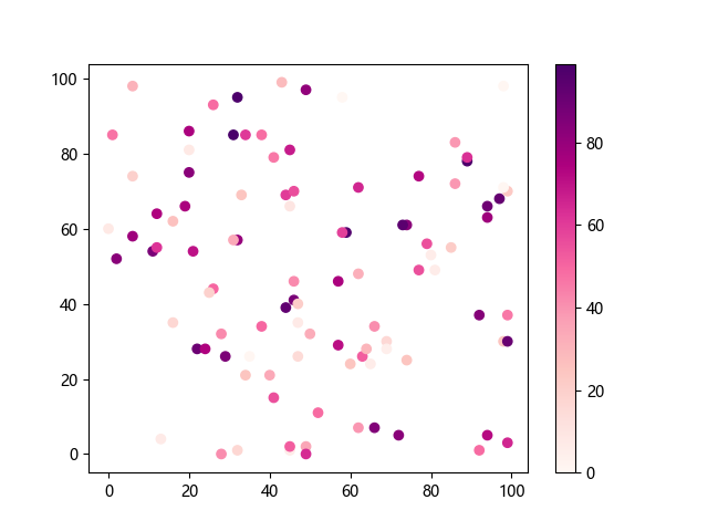 # 这三行代码使编译器能够绘图: import sys import matplotlib matplotlib.use('Agg') import matplotlib.pyplot as plt import numpy as np # 生成随机数据 x = np.random.randint(100, size=(100)) y = np.random.randint(100, size=(100)) colors = np.random.randint(100, size=(100)) # 使用 RdPu 配色方案绘制红紫色渐变色散点图: plt.scatter(x, y, c=colors, cmap='RdPu') plt.colorbar() # 显示颜色条 plt.show() # 显示图形 # 这两行代码使编译器能够输出图形: plt.savefig(sys.stdout.buffer) sys.stdout.flush()