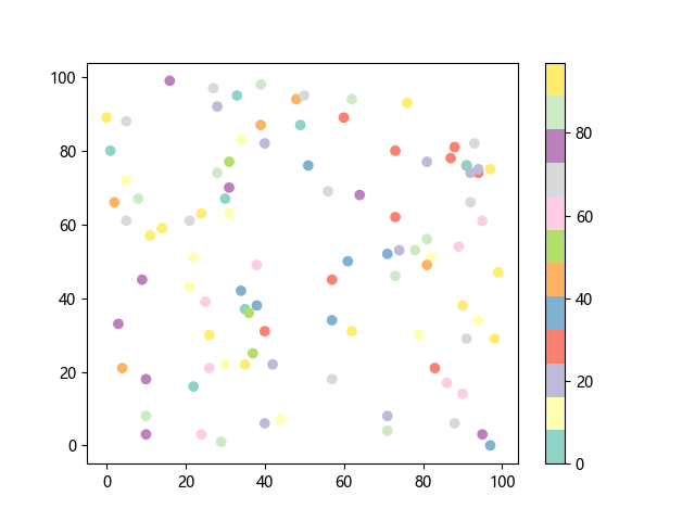 # 这三行代码使编译器能够绘图: import sys import matplotlib matplotlib.use('Agg') import matplotlib.pyplot as plt import numpy as np # 生成随机数据: x = np.random.randint(100, size=(100)) y = np.random.randint(100, size=(100)) colors = np.random.randint(100, size=(100)) # 使用 Set3 (12 色调色板)配色方案绘制 Set3 离散色散点图: plt.scatter(x, y, c=colors, cmap='Set3') plt.colorbar() # 显示颜色条 plt.show() # 显示图形 # 这两行代码使编译器能够输出图形: plt.savefig(sys.stdout.buffer) sys.stdout.flush()
