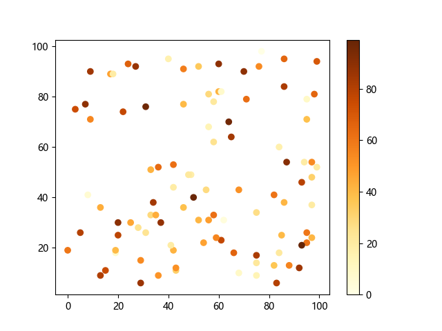 # 这三行代码使编译器能够绘图: import sys import matplotlib matplotlib.use('Agg') import matplotlib.pyplot as plt import numpy as np # 生成随机数据: x = np.random.randint(100, size=(100)) y = np.random.randint(100, size=(100)) colors = np.random.randint(100, size=(100)) # 使用 YlOrBr (黄-橙-棕渐变)配色方案绘制黄橙棕渐变散点图: plt.scatter(x, y, c=colors, cmap='YlOrBr') plt.colorbar() # 显示颜色条 plt.show() # 显示图形 # 这两行代码使编译器能够输出图形: plt.savefig(sys.stdout.buffer) sys.stdout.flush()
