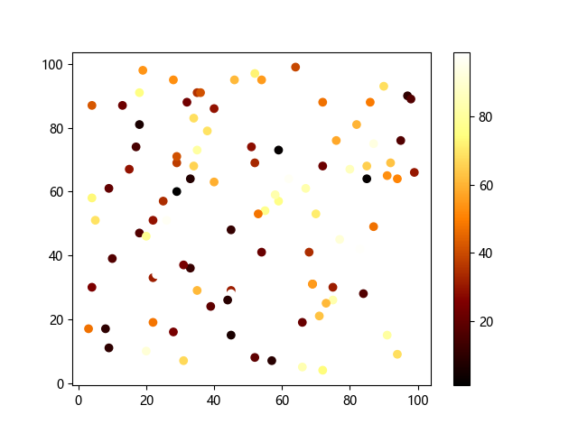 # 这三行代码使编译器能够绘图: import sys import matplotlib matplotlib.use('Agg') import matplotlib.pyplot as plt import numpy as np # 生成随机数据: x = np.random.randint(100, size=(100)) y = np.random.randint(100, size=(100)) colors = np.random.randint(100, size=(100)) # 使用 afmhot (热金属)配色方案绘制热金属色散点图: plt.scatter(x, y, c=colors, cmap='afmhot') plt.colorbar() # 显示颜色条 plt.show() # 显示图形 # 这两行代码使编译器能够输出图形: plt.savefig(sys.stdout.buffer) sys.stdout.flush()