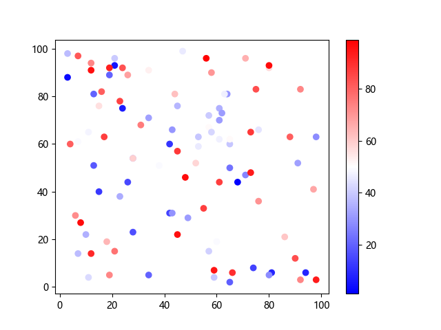 # 这三行代码使编译器能够绘图: import sys import matplotlib matplotlib.use('Agg') import matplotlib.pyplot as plt import numpy as np # 生成随机数据 x = np.random.randint(100, size=(100)) y = np.random.randint(100, size=(100)) colors = np.random.randint(100, size=(100)) # 使用 bwr 配色方案绘制蓝白红渐变色散点图: plt.scatter(x, y, c=colors, cmap='bwr') plt.colorbar() plt.show() # 这两行代码使编译器能够输出图形: plt.savefig(sys.stdout.buffer) sys.stdout.flush()