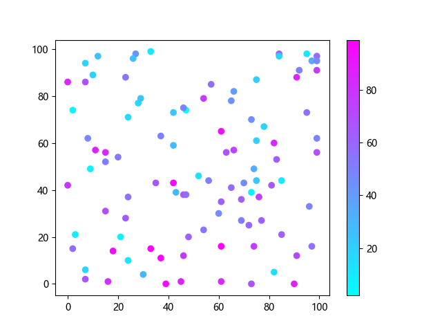 # 这三行代码使编译器能够绘图: import sys import matplotlib matplotlib.use('Agg') import matplotlib.pyplot as plt import numpy as np # 生成随机数据 x = np.random.randint(100, size=(100)) y = np.random.randint(100, size=(100)) colors = np.random.randint(100, size=(100)) # 使用 cool 配色方案绘制冷色调渐变色散点图: plt.scatter(x, y, c=colors, cmap='cool') plt.colorbar() plt.show() # 这两行代码使编译器能够输出图形: plt.savefig(sys.stdout.buffer) sys.stdout.flush()