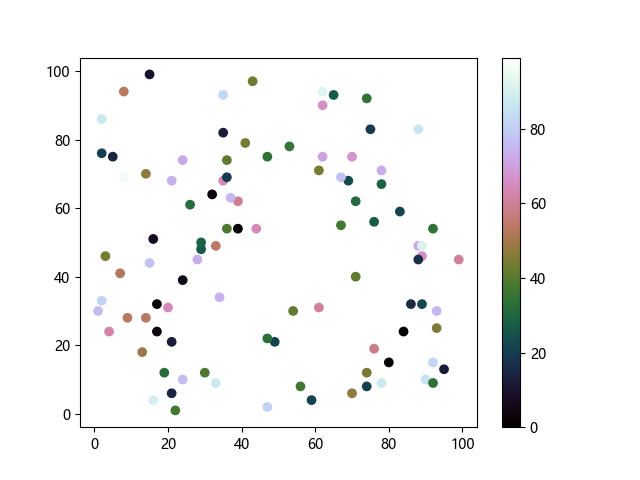 # 这三行代码使编译器能够绘图: import sys import matplotlib matplotlib.use('Agg') import matplotlib.pyplot as plt import numpy as np # 生成随机数据 x = np.random.randint(100, size=(100)) y = np.random.randint(100, size=(100)) colors = np.random.randint(100, size=(100)) # 使用 cubehelix 配色方案绘制螺旋立方体渐变色散点图: plt.scatter(x, y, c=colors, cmap='cubehelix') plt.colorbar() plt.show() # 这两行代码使编译器能够输出图形: plt.savefig(sys.stdout.buffer) sys.stdout.flush()