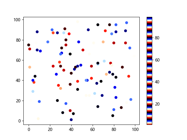 # 这三行代码使编译器能够绘图: import sys import matplotlib matplotlib.use('Agg') import matplotlib.pyplot as plt import numpy as np # 生成随机数据 x = np.random.randint(100, size=(100)) y = np.random.randint(100, size=(100)) colors = np.random.randint(100, size=(100)) # 使用 flag 配色方案绘制旗帜渐变色散点图: plt.scatter(x, y, c=colors, cmap='flag') plt.colorbar() plt.show() # 这两行代码使编译器能够输出图形: plt.savefig(sys.stdout.buffer) sys.stdout.flush()