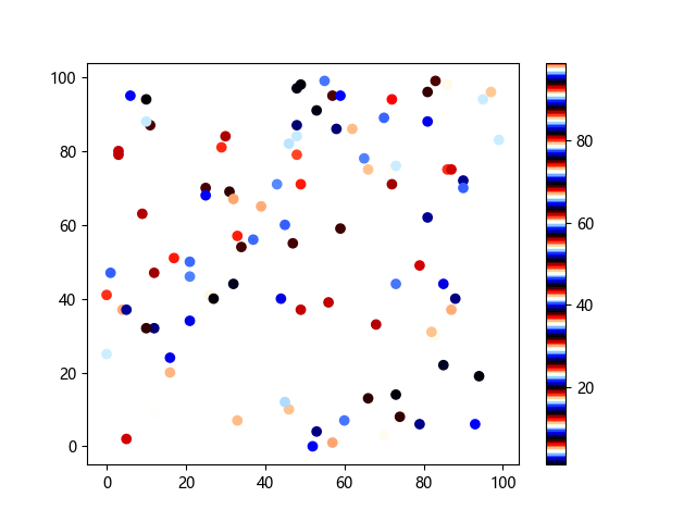 # 这三行代码使编译器能够绘图: import sys import matplotlib matplotlib.use('Agg') import matplotlib.pyplot as plt import numpy as np # 生成随机数据点 x = np.random.randint(100, size=(100)) y = np.random.randint(100, size=(100)) colors = np.random.randint(100, size=(100)) # 使用 flag_r 配色方案绘制旗帜反向渐变色散点图: plt.scatter(x, y, c=colors, cmap='flag_r') plt.colorbar() plt.show() # 这两行代码使编译器能够输出图形: plt.savefig(sys.stdout.buffer) sys.stdout.flush()
