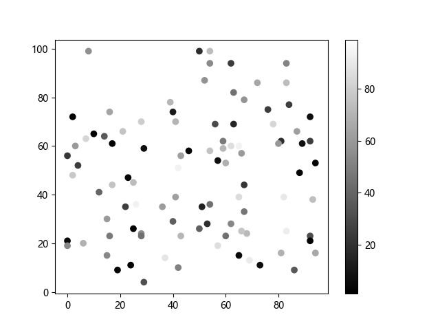 # 这三行代码使编译器能够绘图: import sys import matplotlib matplotlib.use('Agg') import matplotlib.pyplot as plt import numpy as np # 生成随机数据 x = np.random.randint(100, size=(100)) y = np.random.randint(100, size=(100)) colors = np.random.randint(100, size=(100)) # 使用 gist_gray 配色方案绘制灰度渐变色散点图: plt.scatter(x, y, c=colors, cmap='gist_gray') plt.colorbar() plt.show() # 这两行代码使编译器能够输出图形: plt.savefig(sys.stdout.buffer) sys.stdout.flush()
