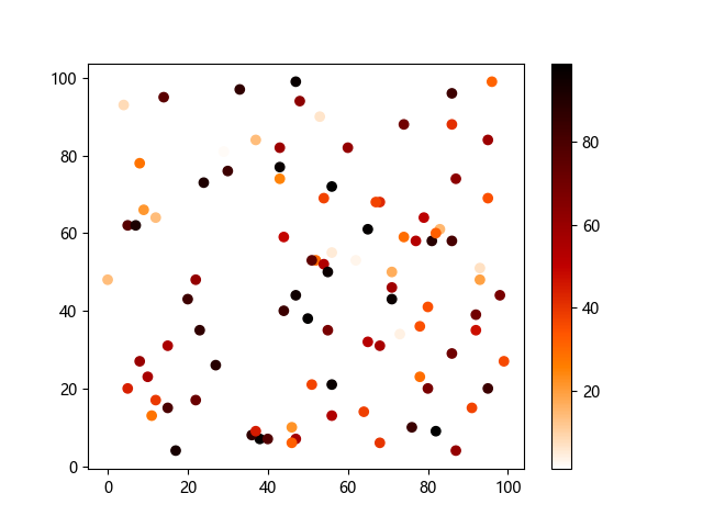 # 这三行代码使编译器能够绘图: import sys import matplotlib matplotlib.use('Agg') import matplotlib.pyplot as plt import numpy as np # 生成随机数据点 x = np.random.randint(100, size=(100)) y = np.random.randint(100, size=(100)) colors = np.random.randint(100, size=(100)) # 使用 gist_heat_r 配色方案绘制热力图反向渐变色散点图: plt.scatter(x, y, c=colors, cmap='gist_heat_r') plt.colorbar() plt.show() # 这两行代码使编译器能够输出图形: plt.savefig(sys.stdout.buffer) sys.stdout.flush()