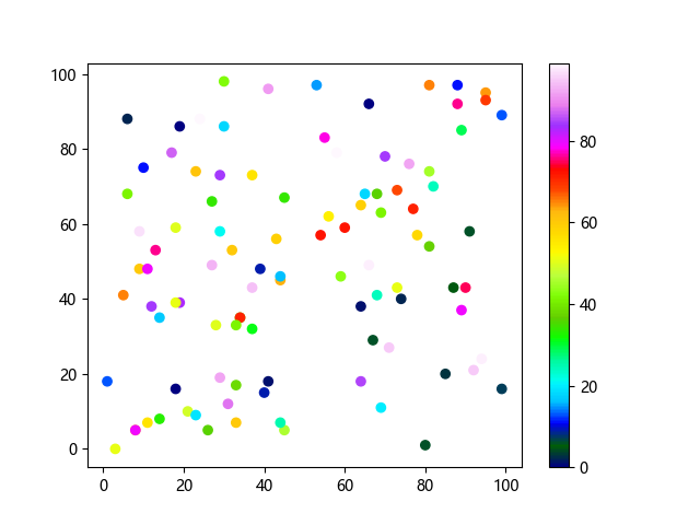 # 这三行代码使编译器能够绘图: import sys import matplotlib matplotlib.use('Agg') import matplotlib.pyplot as plt import numpy as np # 生成随机数据 x = np.random.randint(100, size=(100)) y = np.random.randint(100, size=(100)) colors = np.random.randint(100, size=(100)) # 使用 gist_ncar 配色方案绘制NCAR渐变色散点图: plt.scatter(x, y, c=colors, cmap='gist_ncar') plt.colorbar() plt.show() # 这两行代码使编译器能够输出图形: plt.savefig(sys.stdout.buffer) sys.stdout.flush()