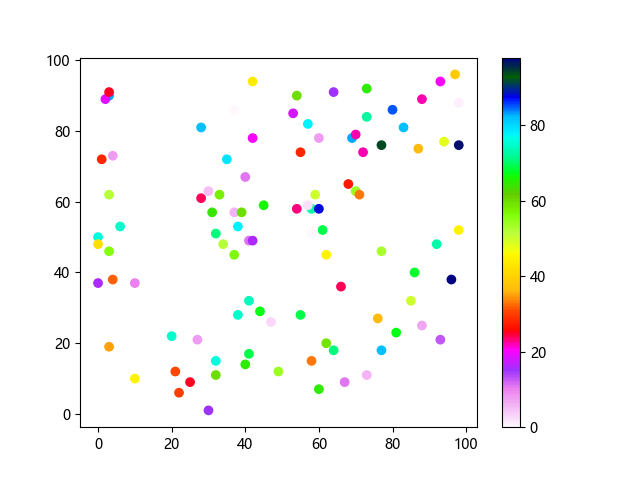 # 这三行代码使编译器能够绘图: import sys import matplotlib matplotlib.use('Agg') import matplotlib.pyplot as plt import numpy as np # 生成随机数据点 x = np.random.randint(100, size=(100)) y = np.random.randint(100, size=(100)) colors = np.random.randint(100, size=(100)) # 使用 gist_ncar_r 配色方案绘制 NCAR 反向渐变色散点图: plt.scatter(x, y, c=colors, cmap='gist_ncar_r') plt.colorbar() plt.show() # 这两行代码使编译器能够输出图形: plt.savefig(sys.stdout.buffer) sys.stdout.flush()