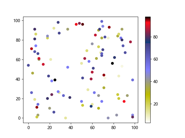 # 这三行代码使编译器能够绘图: import sys import matplotlib matplotlib.use('Agg') import matplotlib.pyplot as plt import numpy as np # 生成随机数据点 x = np.random.randint(100, size=(100)) y = np.random.randint(100, size=(100)) colors = np.random.randint(100, size=(100)) # 使用 gist_stern_r 配色方案绘制星云反向渐变色散点图: plt.scatter(x, y, c=colors, cmap='gist_stern_r') plt.colorbar() plt.show() # 这两行代码使编译器能够输出图形: plt.savefig(sys.stdout.buffer) sys.stdout.flush()