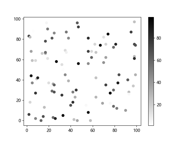 # 这三行代码使编译器能够绘图: import sys import matplotlib matplotlib.use('Agg') import matplotlib.pyplot as plt import numpy as np # 生成随机数据 x = np.random.randint(100, size=(100)) y = np.random.randint(100, size=(100)) colors = np.random.randint(100, size=(100)) # 使用 gist_yarg 配色方案绘制灰度渐变色散点图: plt.scatter(x, y, c=colors, cmap='gist_yarg') plt.colorbar() plt.show() # 这两行代码使编译器能够输出图形: plt.savefig(sys.stdout.buffer) sys.stdout.flush()