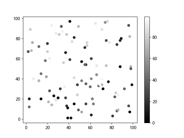 # 这三行代码使编译器能够绘图: import sys import matplotlib matplotlib.use('Agg') import matplotlib.pyplot as plt import numpy as np # 生成随机数据点 x = np.random.randint(100, size=(100)) y = np.random.randint(100, size=(100)) colors = np.random.randint(100, size=(100)) # 使用 gist_yarg_r 配色方案绘制灰度反向渐变色散点图: plt.scatter(x, y, c=colors, cmap='gist_yarg_r') plt.colorbar() plt.show() # 这两行代码使编译器能够输出图形: plt.savefig(sys.stdout.buffer) sys.stdout.flush()