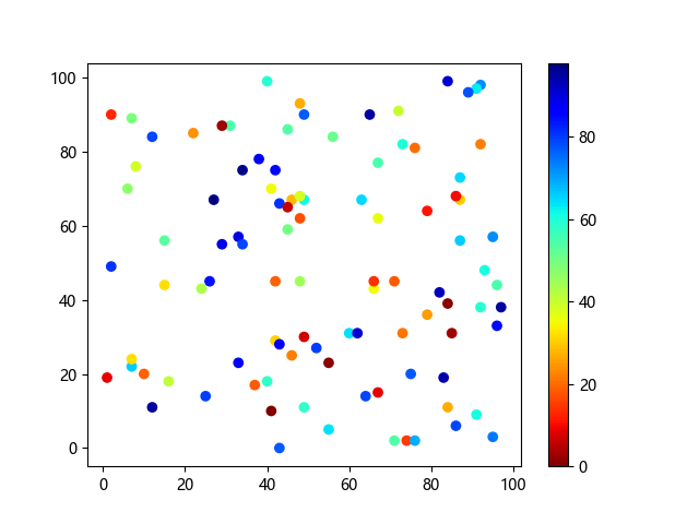 # 这三行代码使编译器能够绘图: import sys import matplotlib matplotlib.use('Agg') import matplotlib.pyplot as plt import numpy as np # 生成随机数据点 x = np.random.randint(100, size=(100)) y = np.random.randint(100, size=(100)) colors = np.random.randint(100, size=(100)) # 使用 jet_r 配色方案绘制 Jet 反向渐变色散点图: plt.scatter(x, y, c=colors, cmap='jet_r') plt.colorbar() plt.show() # 这两行代码使编译器能够输出图形: plt.savefig(sys.stdout.buffer) sys.stdout.flush()
