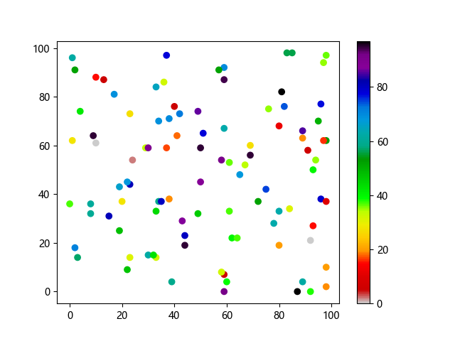 #Three lines to make our compiler able to draw: import sys import matplotlib matplotlib.use('Agg') import matplotlib.pyplot as plt import numpy as np x = np.random.randint(100, size=(100)) y = np.random.randint(100, size=(100)) colors = np.random.randint(100, size=(100)) plt.scatter(x, y, c=colors, cmap='nipy_spectral_r') plt.colorbar() plt.show() #Two lines to make our compiler able to draw: plt.savefig(sys.stdout.buffer) sys.stdout.flush()