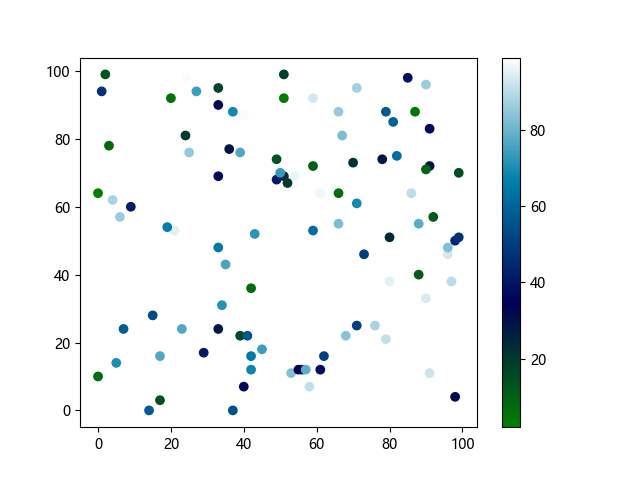 # 这三行代码使编译器能够绘图: import sys import matplotlib matplotlib.use('Agg') import matplotlib.pyplot as plt import numpy as np # 生成随机数据 x = np.random.randint(100, size=(100)) y = np.random.randint(100, size=(100)) colors = np.random.randint(100, size=(100)) # 使用 ocean 配色方案绘制海洋渐变色散点图: plt.scatter(x, y, c=colors, cmap='ocean') plt.colorbar() plt.show() # 这两行代码使编译器能够输出图形: plt.savefig(sys.stdout.buffer) sys.stdout.flush()