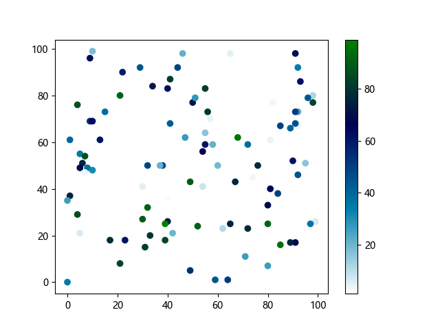 # 这三行代码使编译器能够绘图: import sys import matplotlib matplotlib.use('Agg') import matplotlib.pyplot as plt import numpy as np # 生成随机数据点 x = np.random.randint(100, size=(100)) y = np.random.randint(100, size=(100)) colors = np.random.randint(100, size=(100)) # 使用 ocean_r 配色方案绘制海洋色反向渐变色散点图: plt.scatter(x, y, c=colors, cmap='ocean_r') plt.colorbar() plt.show() # 这两行代码使编译器能够输出图形: plt.savefig(sys.stdout.buffer) sys.stdout.flush()