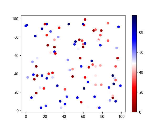 # 以下三行代码使编译器支持绘图功能: import sys import matplotlib matplotlib.use('Agg') import matplotlib.pyplot as plt import numpy as np # 生成随机数据: x = np.random.randint(100, size=(100)) y = np.random.randint(100, size=(100)) colors = np.random.randint(100, size=(100)) # 使用 seismic 反向配色方案创建散点图: plt.scatter(x, y, c=colors, cmap='seismic_r') plt.colorbar() plt.show() # 以下两行代码使编译器能够输出图形: plt.savefig(sys.stdout.buffer) sys.stdout.flush()