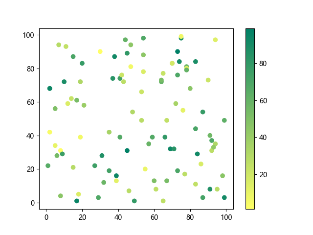 # 以下三行代码使编译器支持绘图功能: import sys import matplotlib matplotlib.use('Agg') import matplotlib.pyplot as plt import numpy as np # 生成随机数据: x = np.random.randint(100, size=(100)) y = np.random.randint(100, size=(100)) colors = np.random.randint(100, size=(100)) # 使用 summer 反向配色方案创建散点图: plt.scatter(x, y, c=colors, cmap='summer_r') plt.colorbar() plt.show() # 以下两行代码使编译器能够输出图形: plt.savefig(sys.stdout.buffer) sys.stdout.flush()