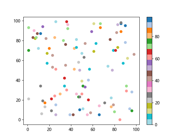 # 以下三行代码使编译器支持绘图功能: import sys import matplotlib matplotlib.use('Agg') import matplotlib.pyplot as plt import numpy as np # 生成随机数据: x = np.random.randint(100, size=(100)) y = np.random.randint(100, size=(100)) colors = np.random.randint(100, size=(100)) # 使用 tab20 反向离散配色方案创建散点图: plt.scatter(x, y, c=colors, cmap='tab20_r') plt.colorbar() plt.show() # 以下两行代码使编译器能够输出图形: plt.savefig(sys.stdout.buffer) sys.stdout.flush()