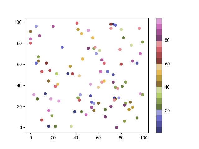 # 以下三行代码使编译器支持绘图功能: import sys import matplotlib matplotlib.use('Agg') import matplotlib.pyplot as plt import numpy as np # 生成随机数据: x = np.random.randint(100, size=(100)) y = np.random.randint(100, size=(100)) colors = np.random.randint(100, size=(100)) # 使用 tab20b 离散配色方案创建散点图: plt.scatter(x, y, c=colors, cmap='tab20b') plt.colorbar() plt.show() # 以下两行代码使编译器能够输出图形: plt.savefig(sys.stdout.buffer) sys.stdout.flush()