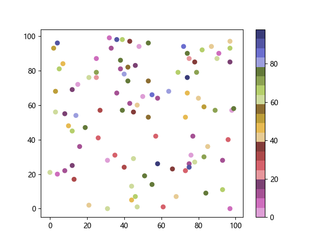 # 以下三行代码使编译器支持绘图功能: import sys import matplotlib matplotlib.use('Agg') import matplotlib.pyplot as plt import numpy as np # 生成随机数据: x = np.random.randint(100, size=(100)) y = np.random.randint(100, size=(100)) colors = np.random.randint(100, size=(100)) # 使用 tab20b 反向离散配色方案创建散点图: plt.scatter(x, y, c=colors, cmap='tab20b_r') plt.colorbar() plt.show() # 以下两行代码使编译器能够输出图形: plt.savefig(sys.stdout.buffer) sys.stdout.flush()