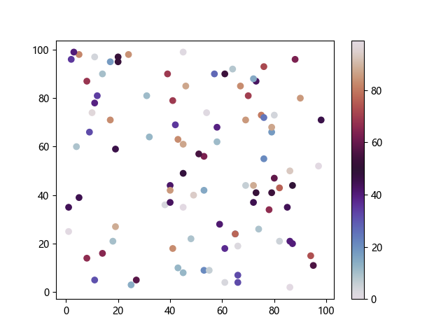 # 以下三行代码使编译器支持绘图功能: import sys import matplotlib matplotlib.use('Agg') import matplotlib.pyplot as plt import numpy as np # 生成随机数据: x = np.random.randint(100, size=(100)) y = np.random.randint(100, size=(100)) colors = np.random.randint(100, size=(100)) # 使用 twilight 配色方案创建散点图: plt.scatter(x, y, c=colors, cmap='twilight') plt.colorbar() plt.show() # 以下两行代码使编译器能够输出图形: plt.savefig(sys.stdout.buffer) sys.stdout.flush()