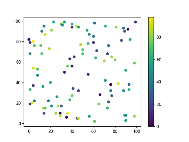 # 以下三行代码使编译器支持绘图功能: import sys import matplotlib matplotlib.use('Agg') import matplotlib.pyplot as plt import numpy as np # 生成随机数据: x = np.random.randint(100, size=(100)) y = np.random.randint(100, size=(100)) colors = np.random.randint(100, size=(100)) # 使用 viridis 配色方案创建散点图: plt.scatter(x, y, c=colors, cmap='viridis') plt.colorbar() plt.show() # 以下两行代码使编译器能够输出图形: plt.savefig(sys.stdout.buffer) sys.stdout.flush()