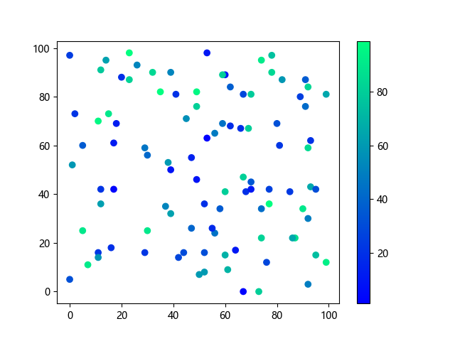 # 以下三行代码使编译器支持绘图功能: import sys import matplotlib matplotlib.use('Agg') import matplotlib.pyplot as plt import numpy as np # 生成随机数据: x = np.random.randint(100, size=(100)) y = np.random.randint(100, size=(100)) colors = np.random.randint(100, size=(100)) # 使用冬季 (winter) 配色方案创建散点图: plt.scatter(x, y, c=colors, cmap='winter') plt.colorbar() plt.show() # 以下两行代码使编译器能够输出图形: plt.savefig(sys.stdout.buffer) sys.stdout.flush()