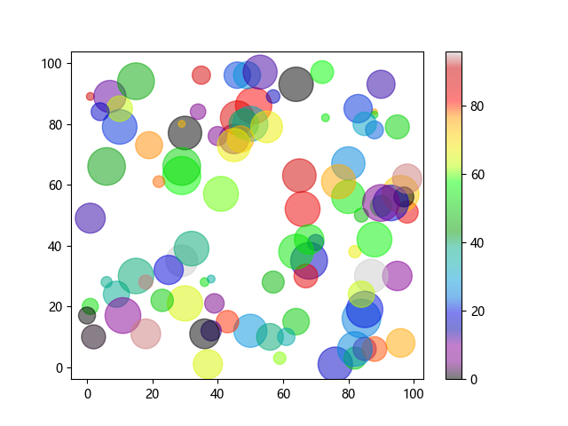 # 以下三行代码使编译器支持绘图功能: import sys import matplotlib matplotlib.use('Agg') import matplotlib.pyplot as plt import numpy as np # 生成随机数据: x = np.random.randint(100, size=(100)) y = np.random.randint(100, size=(100)) colors = np.random.randint(100, size=(100)) sizes = 10 * np.random.randint(100, size=(100)) # 点大小(10-990随机值) # 使用光谱配色、半透明效果创建散点图: plt.scatter(x, y, c=colors, s=sizes, alpha=0.5, cmap='nipy_spectral') plt.colorbar() plt.show() # 以下两行代码使编译器能够输出图形: plt.savefig(sys.stdout.buffer) sys.stdout.flush()