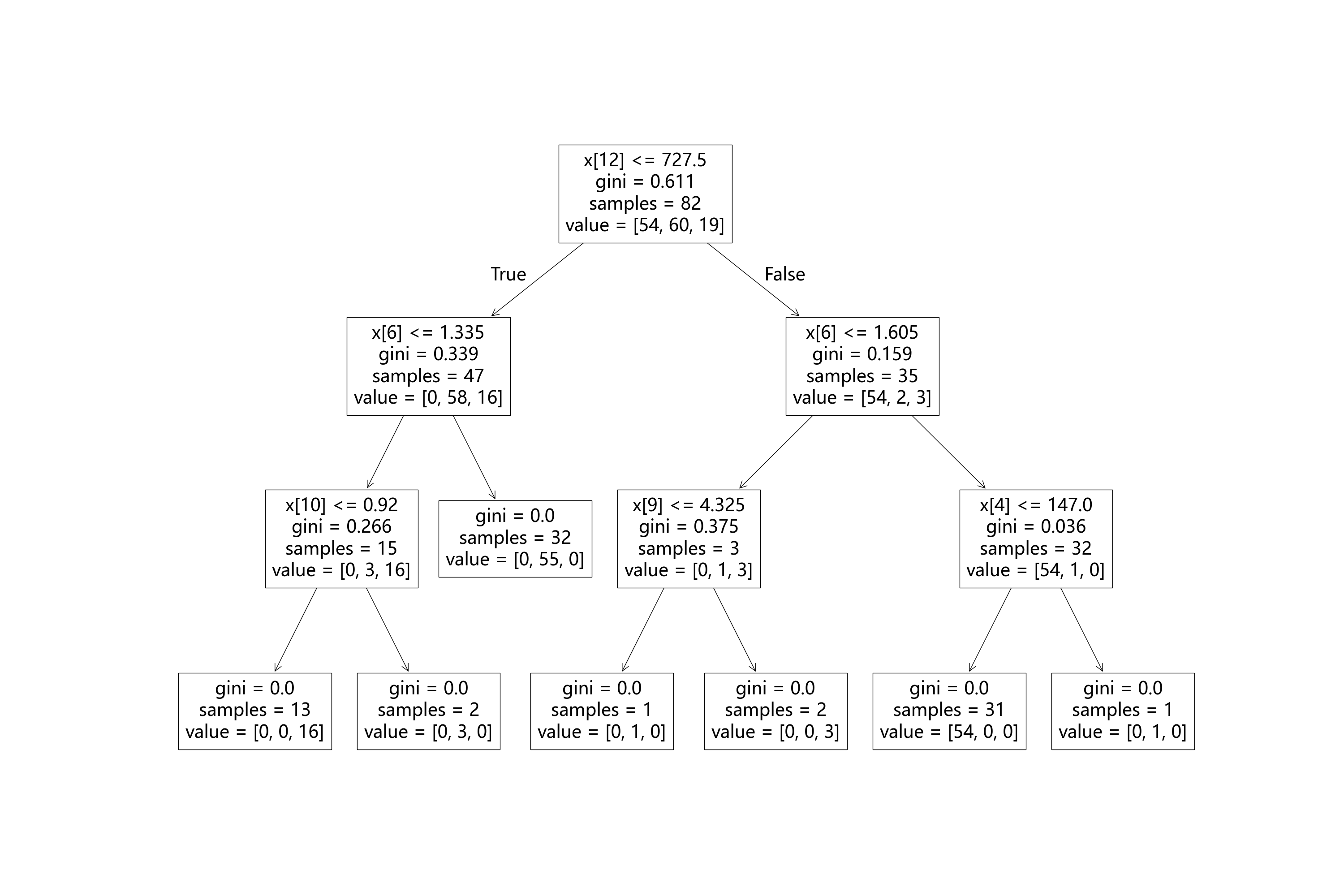 # 这三行代码使编译器支持绘图功能: import sys import matplotlib matplotlib.use('Agg') import matplotlib.pyplot as plt from sklearn import datasets from sklearn.model_selection import train_test_split from sklearn.ensemble import BaggingClassifier from sklearn.tree import plot_tree # 加载葡萄酒数据集: data = datasets.load_wine() # 准备特征数据和标签: X = data.data y = data.target # 划分训练集和测试集(25% 作为测试集): X_train, X_test, y_train, y_test = train_test_split( X, y, test_size=0.25, random_state=22 ) # 创建带 OOB 评估的 Bagging 分类器: oob_model = BaggingClassifier( n_estimators=12, oob_score=True, random_state=22 ) # 训练模型: oob_model.fit(X_train, y_train) # 创建另一个相同的分类器用于可视化: clf = BaggingClassifier( n_estimators=12, oob_score=True, random_state=22 ) clf.fit(X_train, y_train) # 设置大尺寸画布: plt.figure(figsize=(30, 20)) # 绘制第一个基学习器的决策树: plot_tree(clf.estimators_[0]) # 这两行代码使编译器能够输出图形: plt.savefig(sys.stdout.buffer) sys.stdout.flush()