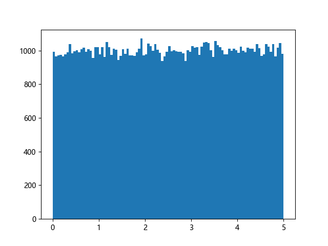 # 使编译器支持绘图的三行配置: import sys import matplotlib matplotlib.use('Agg') import numpy import matplotlib.pyplot as plt x = numpy.random.uniform(0.0, 5.0, 100000) plt.hist(x, 100) plt.show() # 实现编译器绘图功能的两行代码: plt.savefig(sys.stdout.buffer) sys.stdout.flush()