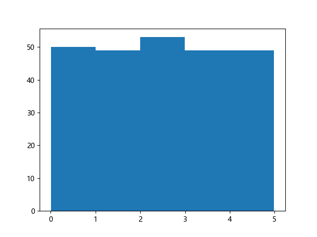 # 使我们的编译器能够绘制的三行代码: import sys import matplotlib matplotlib.use('Agg') import numpy import matplotlib.pyplot as plt x = numpy.random.uniform(0.0, 5.0, 250) plt.hist(x, 5) plt.show() # 使我们的编译器能够绘制的两行代码: plt.savefig(sys.stdout.buffer) sys.stdout.flush()