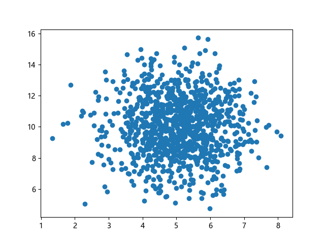 # 三行配置使编译器支持绘图功能: import sys import matplotlib matplotlib.use('Agg') import numpy import matplotlib.pyplot as plt # 生成正态分布数据:x~N(5.0,1.0),y~N(10.0,2.0),各 1000 个样本点: x = numpy.random.normal(5.0, 1.0, 1000) y = numpy.random.normal(10.0, 2.0, 1000) # 绘制散点图 plt.scatter(x, y) plt.show() # 两行代码实现图形输出: plt.savefig(sys.stdout.buffer) sys.stdout.flush()