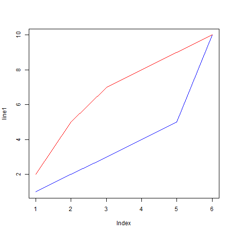# 我们需要这行代码才能在编译器中显示图表 png(filename="output.png") line1 <- c(1,2,3,4,5,10) line2 <- c(2,5,7,8,9,10) # 绘制 line1 的数据,线条为蓝色: plot(line1, type = "l", col = "blue") # 在同一图中添加 line2 的数据,线条为红色: lines(line2, type="l", col = "red")
